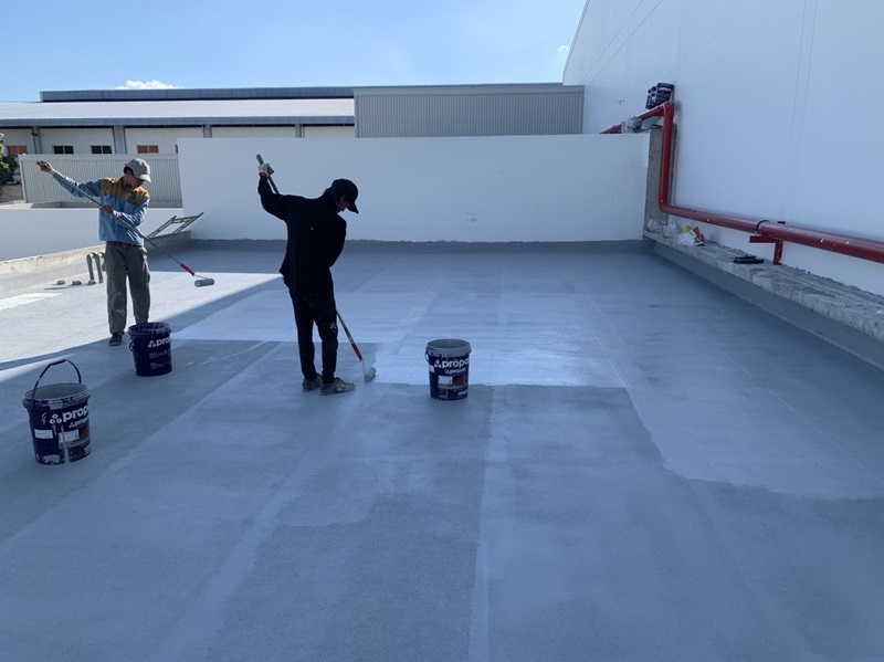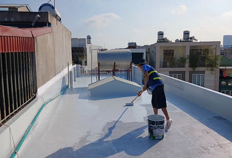 - Bước 3: Thi công lớp chống thấm. Tùy vào khu vực (nhà tắm, ban công hay sàn mái). Chúng tôi sẽ sử dụng các loại vật liệu cao cấp như keo chống thấm gốc Epoxy. Màng chống thấm lỏng hoặc các loại sơn chống thấm, vữa chống thấm siêu đàn hồi.