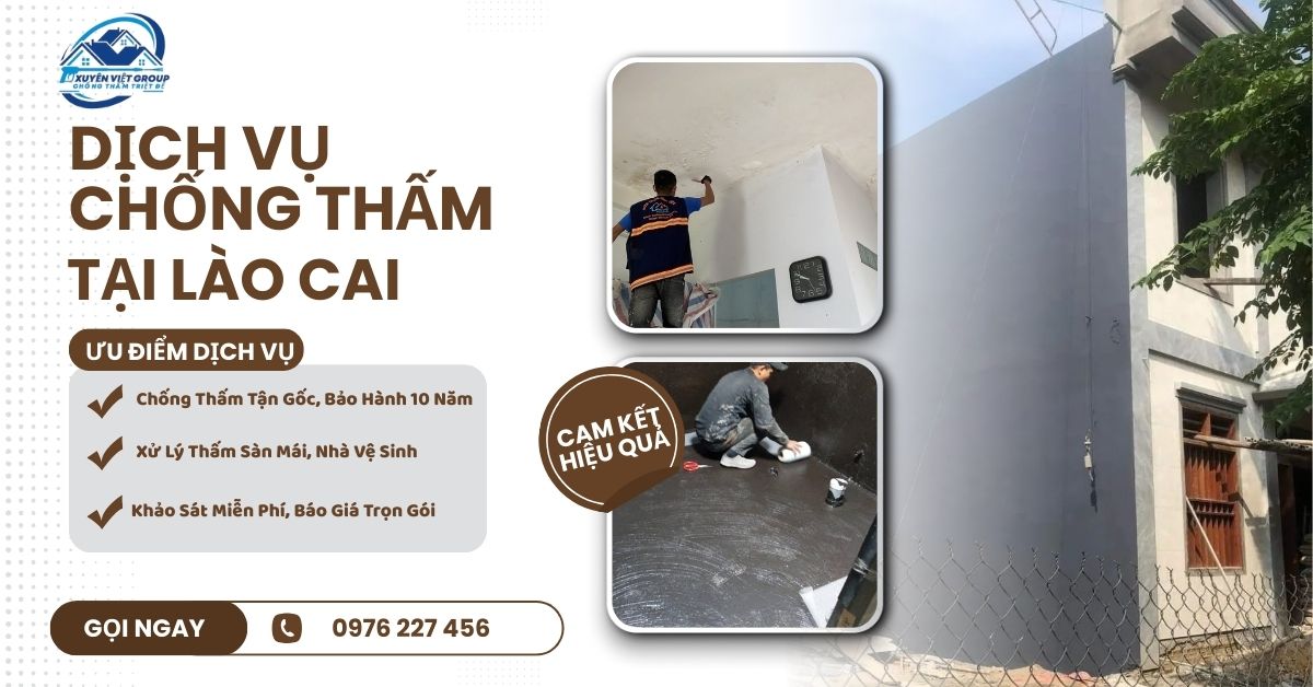 Xuyên Việt Group cung cấp dịch vụ chống thấm Lào Cai chuyên nghiệp, bao gồm chống thấm trần nhà, mái bê tông, tường ngoại thất, tầng hầm, nhà vệ sinh, bể nước, sân thượng, ban công, với các giải pháp màng bitum khò nóng, sơn chống thấm, keo Polyurethane, màng tự dính, phụ gia Sika. Mỗi công trình được khảo sát kỹ lưỡng, thi công đúng kỹ thuật và bảo hành từ 5–10 năm. Liên hệ Hotline: 0976 227 456 để được tư vấn nhanh và xử lý thấm dột triệt để, tiết kiệm chi phí về lâu dài, đảm bảo an toàn và thẩm mỹ cho ngôi nhà của bạn.