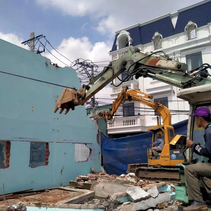 Lắp đặt hệ thống lưới che chắn, giàn giáo xung quanh công trình. Thực hiện phá dỡ từ trên xuống dưới bằng máy móc chuyên dụng kết hợp thủ công. Đặc biệt quan trọng với các công trình trong hẻm hẹp, tránh ảnh hưởng đến kết cấu nhà liền kề.