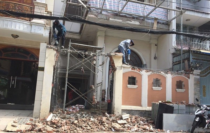 Lắp đặt hệ thống lưới che chắn, giàn giáo xung quanh công trình. Thực hiện phá dỡ từ trên xuống dưới bằng máy móc chuyên dụng kết hợp thủ công. Đặc biệt quan trọng với các công trình trong hẻm hẹp, tránh ảnh hưởng đến kết cấu nhà liền kề.